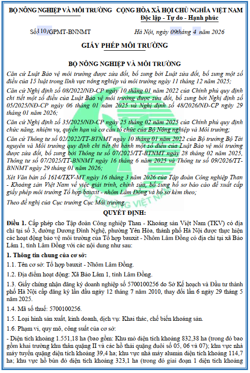 Cấp phép cho Tập đoàn Công nghiệp Than - Khoáng sản Việt Nam (TKV) có địa chỉ tại số 3, đường Dương Đình Nghệ, phường Yên Hòa, thành phố Hà Nội được thực hiện các hoạt động bảo vệ môi trường của Tổ hợp bauxit - Nhôm Lâm Đồng có địa chỉ tại xã Bảo Lâm 1, tỉnh Lâm Đồng